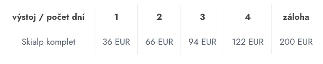 Požičanie skialpového kompletu, ktorý pozostáva zo skialpových lyží s pinovým skialpovým viazaním, pásov, skialpových lyžiarok a teleskopických skialpových paličiek.